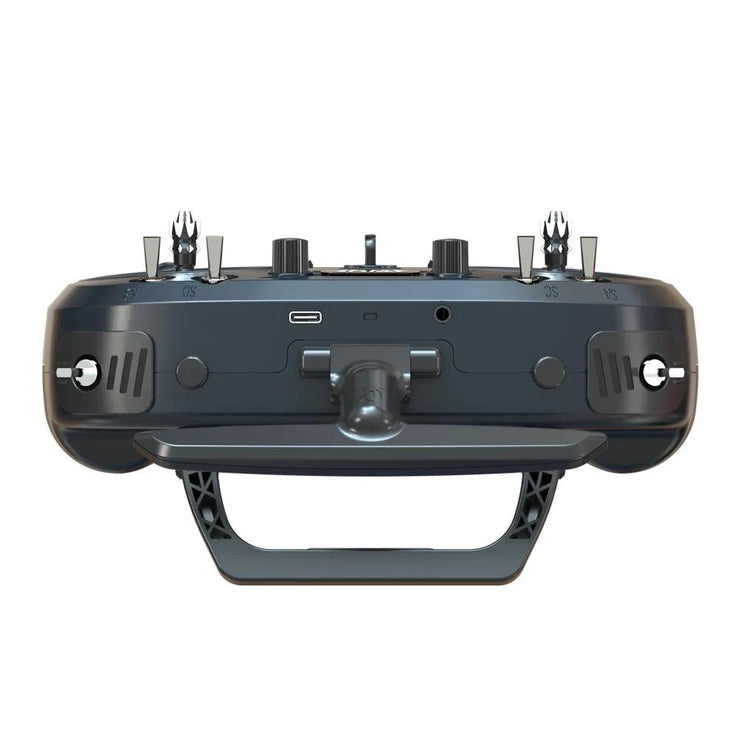 On the back we find a folding handle for easy transport and a standard JR shaft for expansion with external modules, a fan for active cooling of the ELRS module, thanks to which up to 1W of power is supported, and a battery shaft. The shaft can accommodate two Liion batteries (not included) of size 21700, which will noticeably extend the battery life. The batteries are conveniently charged via the USB-C connector. The Jumper T14 supports 10W charging power.
